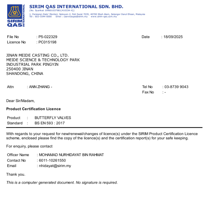 Meide Group's gate valves, butterfly valves, and check valves have obtained SIRIM certification