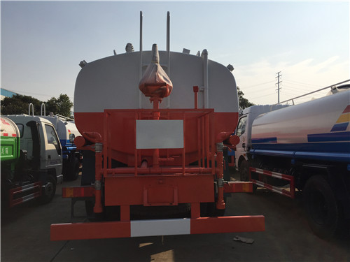 灑水車噴水出口: 前沖,后灑,后工作臺(tái)高炮,前沖(噴)后灑、帶側(cè)噴(花灑)、帶后工作平臺(tái)、平臺(tái)上安裝綠化灑水高炮(炮有大雨、中雨、毛毛雨、霧狀可調(diào)節(jié)),帶吸水管,帶消防接頭