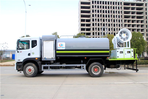改裝配置:罐體用4MM碳鋼板制作,罐內隔板具有防波作用,以減低灑水車行駛時罐體液體的沖擊。整車帶一個專用灑水泵(垂直最大吸程6米),灑水寬度14米,射程28米。多功能灑水車配備2個前沖(噴)(能將路面泥巴、塵土、垃圾沖干凈);2個后灑(能均勻地將水灑在路面,一次灑水寬度14米)、2個側噴(花灑)(能均勻地將路旁綠化帶澆灌)、帶1個后工作平臺,平臺上安裝1個綠化灑水高炮(灑水炮可全方位旋轉,可連續調成直沖狀、大雨、小雨、毛毛雨,霧狀可調節沖洗高大樹木),引水時間<5min,流量90m3/h。帶1個消防接頭,帶1個自流閥,1個過濾裝置、人性化爬梯及側防護欄,安裝灑水音樂喇叭。