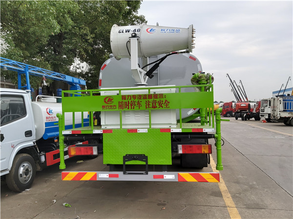 目前最受房地產歡迎的多功能灑水車為噴霧灑水車,該車除了常規的灑水車的配置以外,還加裝了一套噴霧系統,噴霧系統主要由電機,電泵和噴灑總成組成,最大作業半徑為35米,可以遙控電控,噴霧系統可以旋轉,點頭工作。噴霧系統最大電機功率高達5.5千瓦,水泵點功率6千瓦,風機攜帶18個噴霧頭,噴霧頭可更換。