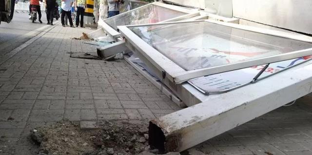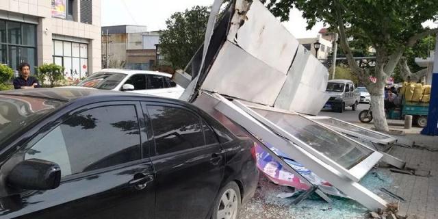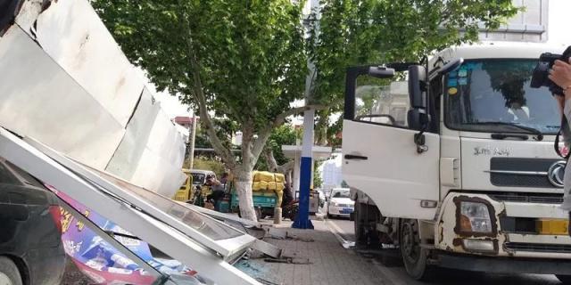 在現(xiàn)場看到,闖禍的洗掃車,停在東側(cè)的非機動車道上,而旁邊被撞的公交站臺已經(jīng)倒地,站臺棚損毀嚴重,站臺下面還砸著一輛黑色私家車。