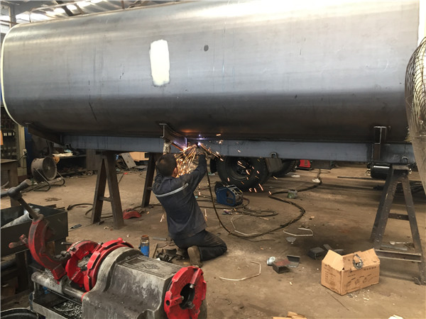 工人們把灑水車罐體和灑水車罐蓋進行對接,吊車將灑水車罐體底座運往罐體上方,工人正在焊接灑水車罐體底座,已焊接完成的碳鋼罐體