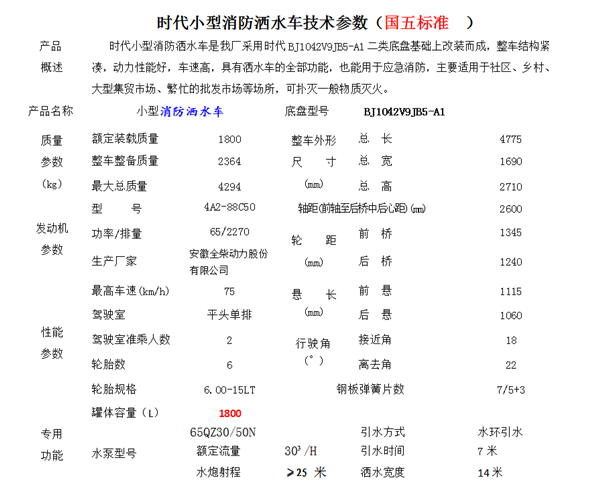 采用東風多利卡底盤EQ1110TFJ,單排或排半駕駛室,配備朝柴120馬力國五發動機,825-16輪胎,外形尺寸7650×2300×3170(mm),消防泵后置帶卷簾門,水罐容積6.5立方米,東風消防水車配備20或30消防泵和消防炮,射程≥45米,消防灑水車可用于森林消防滅火,社區,村鎮等一般性消防戰備滅火,同時也可以用于綠化灑水,抗旱供水運水等。該車罐體有效容積:6噸-8噸,該車帶國家免征公告。帶專用灑水泵,可自吸自排,帶前沖后灑,側噴,后工作平臺上配灑水高炮.