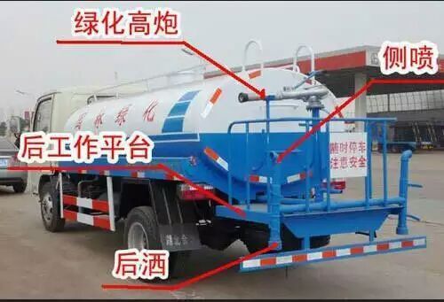 改裝配置:罐體用4MM碳鋼板制作,罐內(nèi)隔板具有防波作用,以減低汽車行駛時(shí)罐體液體的沖擊。整車帶一個(gè)專用灑水泵(垂直最大吸程6米),灑水寬度14米,射程28米。多功能灑水車配備2個(gè)前沖(噴)(能將路面泥巴、塵土、垃圾沖干凈);2個(gè)后灑(能均勻地將水灑在路面,一次灑水寬度14米)、2個(gè)側(cè)噴(花灑)(能均勻地將路旁綠化帶澆灌)、帶1個(gè)后工作平臺(tái),平臺(tái)上安裝1個(gè)綠化灑水高炮(灑水炮可全方位旋轉(zhuǎn),可連續(xù)調(diào)成直沖狀、大雨、小雨、毛毛雨,霧狀可調(diào)節(jié)沖洗高大樹木),引水時(shí)間<5min,流量90m3/h。帶1個(gè)消防接頭,帶1個(gè)自流閥,1個(gè)過濾裝置、人性化爬梯及側(cè)防護(hù)欄,安裝灑水音樂喇叭。