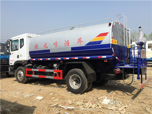 罐體用4MM碳鋼板制作,罐內隔板具有防波作用,以減低汽車行駛時罐體液體的沖擊。整車帶一個專用灑水泵(垂直最大吸程6米),灑水寬度14米,射程28米。多功能灑水車配備2個前沖(噴)(能將路面泥巴、塵土、垃圾沖干凈);2個后灑(能均勻地將水灑在路面,一次灑水寬度14米)、2個側噴(花灑)(能均勻地將路旁綠化帶澆灌)、帶1個后工作平臺,平臺上安裝1個綠化灑水高炮(灑水炮可全方位旋轉,可連續調成直沖狀、大雨、小雨、毛毛雨,霧狀可調節沖洗高大樹木),引水時間<5min,流量90m3/h。帶1個消防接頭,帶1個自流閥,1個過濾裝置、人性化爬梯及側防護欄,安裝灑水音樂喇叭。