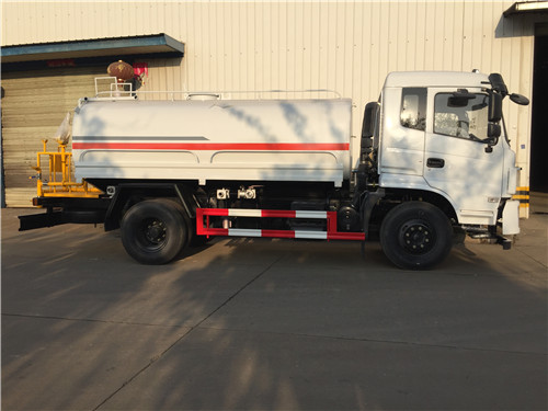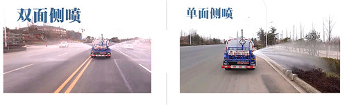灑水車前裝有鴨形噴嘴或圓頭沖嘴,后面裝有圓柱開灑水噴嘴或蓮蓬頭噴嘴,后部有一工作平臺,裝配有水炮。后部還可裝8個噴嘴(選裝)噴水器一般用于沖洗街道,起除塵和降溫作用,其噴水器可以用調(diào)節(jié)噴嘴螺紋的方法改變噴水器的噴灑方向和角度,高射水炮可以用于城鄉(xiāng)園林綠化及應(yīng)急消防。蓮蓬嘴可以澆落路中間噴水器沖起的灰塵,起到清潔空氣的作用。