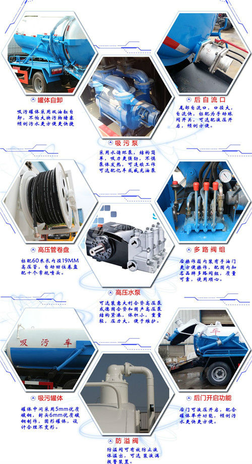 吸污罐體優質碳鋼板采用5-6mm厚,水罐罐體厚度為4mm厚,高壓泵為德國品浮,億豐真空油泵或山東美卓SK6水循環泵,水油分離器,防溢閥,洗手裝置,多路換向閥,真空壓力表,視污窗或視污管,罐體后部出口為100球閥,或150球閥,罐體可液壓舉升,后蓋可液壓打開,吸污管8米。 高壓清洗管60米 帶卷盤。