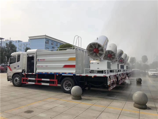 二種是工地使用的抑塵車,這種抑塵車就是灑水車加裝的霧炮,由于工地上的拆遷造成的灰塵是非常大的,要是用第一種抑塵車,會造成灰塵飛的到處都是,那是因為第一種抑塵車噴霧非常細,水量打不到工地拆遷的要求,而灑水車加裝的霧炮,水流量要別第一種大。為了減少拆遷工地揚塵污染降塵,各地政府大量購置抑塵車,也稱霧炮車,專門用于拆遷工地降塵控制,湖北程力專用汽車股份有限公司抑塵車噴霧距離為30到120余米,最大蓄水量近25噸,主要作用是噴霧抑塵,同時具備灑水車和道路沖洗車功能,可以有效抑制揚塵的產(chǎn)生。