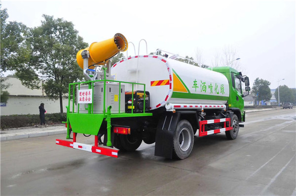 大運(yùn)抑塵車配置有大功率抑塵泵,抑塵泵帶自吸功能,能垂直吸6米,吸力非常大,還帶有消防接水口,能快速接水,灑水裝置有前沖,后灑,側(cè)噴,后工作平臺(tái),平臺(tái)上安全綠化抑塵水炮,其灑水車寬度14米,水炮射程可達(dá)30米,綠化抑塵水炮可旋轉(zhuǎn)360°,還可調(diào)節(jié)成水柱裝,霧狀,大中小可任意調(diào)解,射程非常遠(yuǎn)。
