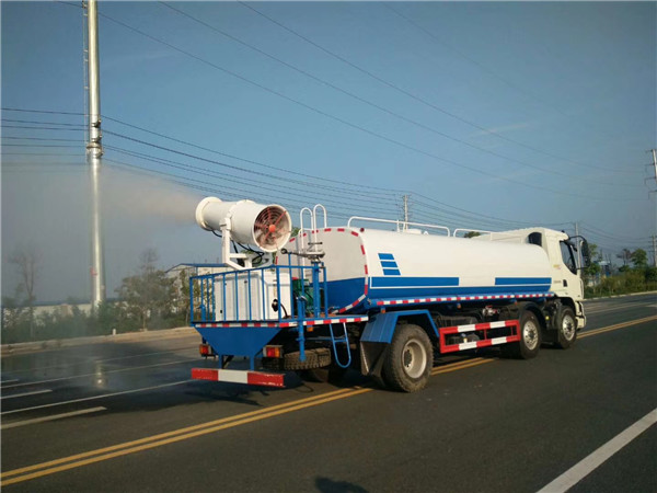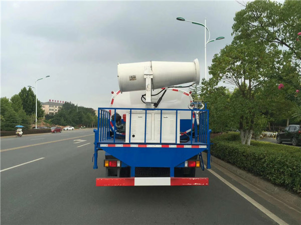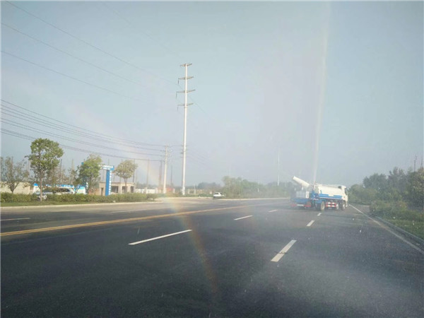 灑水車后工作平臺安裝有湖北程力公司自行設計的扇形噴嘴,主要對路面進行保潔和壓塵,灑水寬度可達14m以上(角度可自行調整)。該裝置的優點為灑水呈霧狀或半霧狀,具有較好的壓塵和增濕效果。