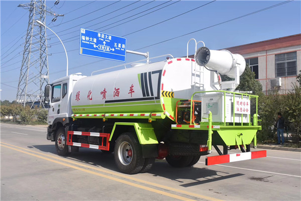 1、高壓水炮――位于東風D9國六14.5方噴霧車后工作平臺上,可360度全方位旋轉,可連續(xù)調節(jié)成:柱狀、開花狀、大雨、中雨、毛毛雨、半霧狀等水流形態(tài),射程28米,可用于遠離沖洗建筑物、樹木、應急消防救火、重污染路面的定點清洗等。