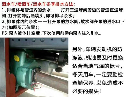 5、灑水車整車水路系統(tǒng)無(wú)防凍裝置,因此嚴(yán)寒地區(qū),氣溫?cái)z氏度以下使用后,應(yīng)立即將水泵、水罐及水路系統(tǒng)中的積水全部放凈,注意水泵放水螺塞放水后應(yīng)關(guān)閉嚴(yán)密,確保密封,否則將影響水泵吸水。