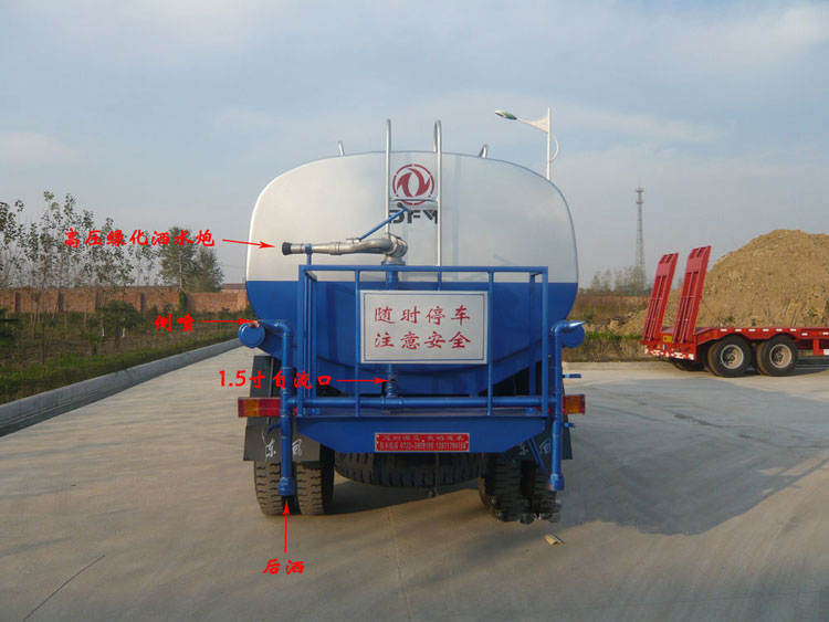 東風灑水車標準配置:帶前沖、后灑、帶側噴、帶后工作平臺。灑水車后工作平臺上安裝綠化灑水高炮。高炮可360°旋轉,可連續調成直沖狀、大雨、小雨、毛毛雨、霧狀等多種形態,并配備專用大功率灑水泵,帶消防接頭,帶自流閥,帶自吸功能。灑水車垂直吸程≥6米,灑水寬度≥14米,高炮射程≥28米。