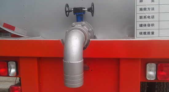 瀝青運輸車也叫液態瀝青保溫運輸車,由于液態瀝青介質比較粘稠,而且有一定的溫度要求,所以排泄大多屬于自流。一般瀝青運輸車自流裝置在車輛的尾部,采用耐高溫球閥控制。如下圖。