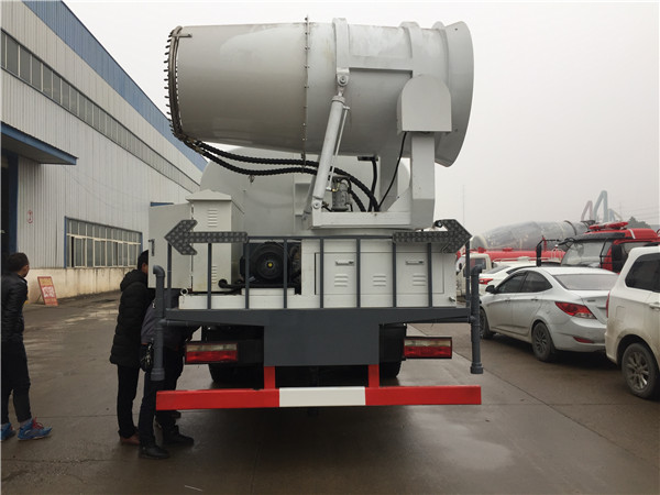 抑塵車風送系統啟動后,起動噴霧系統,先關閉噴霧截止閥,使藥液泵泵出的水匯流到藥箱工作5分鐘,使農藥和水充分混合。打開噴霧截止閥噴霧,調節液泵壓力調節裝置,使工作壓力在規定要求下。