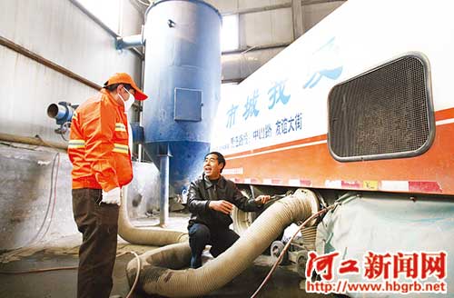 在掃路車車廂下裝上一根大管子,直接吸走粉塵、雜物,最大程度地降低揚塵現(xiàn)象。近日,在石家莊市橋西區(qū)環(huán)衛(wèi)大隊粉塵清倒車間,這臺巨型“吸塵器”和他的發(fā)明人——環(huán)衛(wèi)大隊副大隊長劉秀江給我們介紹了這臺掃路車。