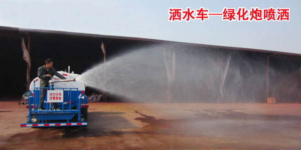 ◆ 灑水車綠化高炮功能:綠化高炮位于灑水車的后工作平臺,可全方位旋轉,并可調節多種噴灑、噴射方式(柱狀射程≥28m;霧狀射程≥15m)。綠化炮霧狀噴灑可用于園林綠化噴灑作業;綠化高炮噴射一般用于沖洗澆灌樹木;綠化炮沖洗一般用于護欄沖洗、高空建筑物沖洗等。