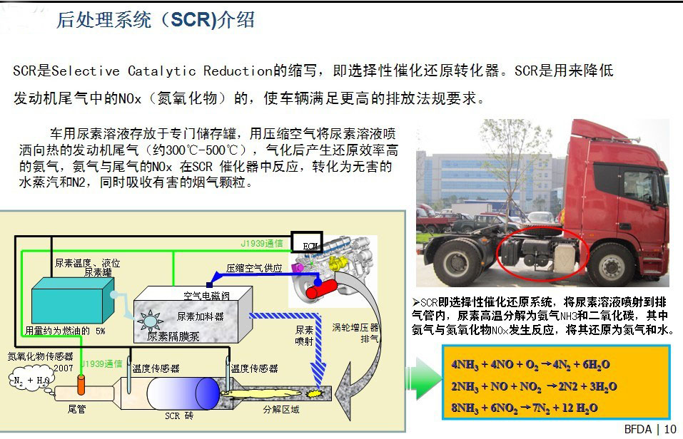 電控+SCR技術是通過使用選擇性催化還原(SCR)技術,利用尿素溶液對尾氣中的氮氧化物進行處理。車用尿素溶液存放于專門儲存罐,用壓縮空氣將尿素溶液噴灑向熱的發動機尾氣(約300℃-500℃),氣化后產生還原效率高的氨氣,氨氣與尾氣的NOx 在SCR 催化器中反應,轉化為無害的水蒸汽和N2,同時吸收有害的煙氣顆粒;SCR即選擇性催化還原系統,將尿素溶液噴射到排氣管內,尿素高溫分解為氨氣NH3和二氧化碳,其中氨氣與氮氧化物NOx發生反應,將其還原為氮氣和水。