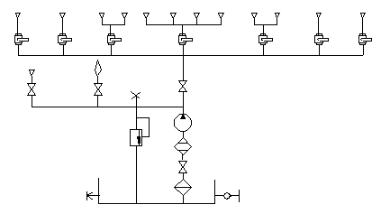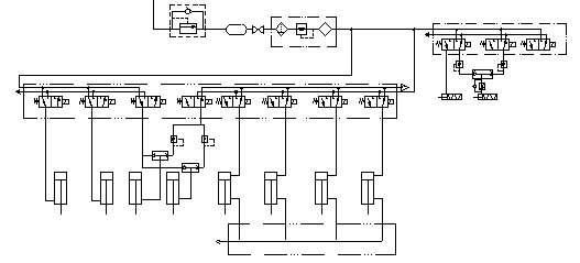 氣動系統(tǒng)從底盤貯氣筒取得氣源,工作壓力≮0.6Mpa。根據(jù)不同的作業(yè)要求,由電磁閥控制各個氣缸實現(xiàn)不同的動力組合。