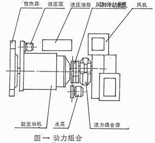 動力組合由散熱器、副發(fā)動機、液力偶合器、皮帶傳動裝置、風機組成。為清掃作業(yè)提供動力源。動力組合通過副框架固定在底盤大梁上。