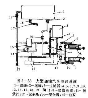 泵進出口之間并聯了一個安全閥14。過濾器安裝在油泵出油管路上,也可安裝在油泵進油管路上。流量計設置在油液過濾后的油路上,用于監測加油量。為了監測主要部件的工作情況和某些加油性能,在油路上可設置一些監測儀表。如在油泵出口安裝壓力表,監測油泵的工作壓力,在油泵進油口安裝無休止空壓力表,監測油泵進口真空安裝大小隨時掌握油泵的工作情況,在過濾器上安裝壓差表,監測過濾器進出口壓力差,基壓差大于某一值,表示濾芯已堵塞,應立即進行清理,若壓差小于另一值,表示濾芯已被擊穿,則應更換。操縱各種閥門的開啟或關閉實現上述五種功能。當開啟閥門5、7、10、16時,罐中油液經油泵、 管道、閥7、過濾器3、流量計11、閥10或5給受油容器加油;當開啟閥門16、19時,罐內油液經閥16、油泵15、閥19返回油罐進行內部循環,攪勻罐內油液,當開啟閥4、13時,可起泵站作用,即將油庫或其它貯油設備的油料經本車油泵輸給受油設備,當開啟閥4、19時,為本車油罐自吸裝油。閥17、18用來排放罐內的水分和沉淀的雜質。