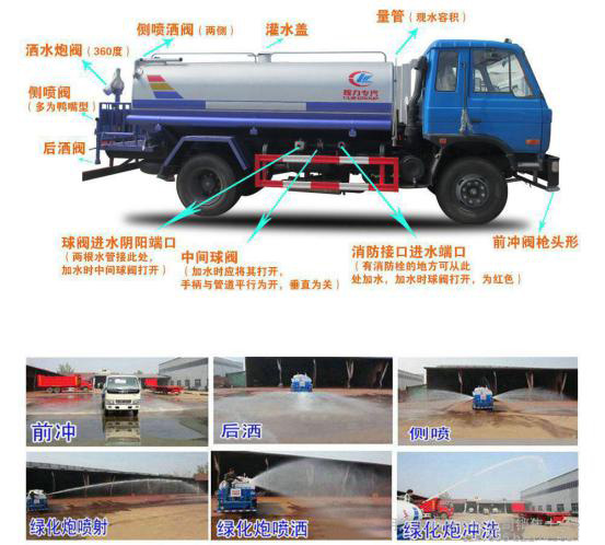 前沖(一般安裝在駕駛室前,也有安裝在駕駛室和罐體之間),后灑、側噴,后工作平臺并配有綠化灑水炮。綠化灑水炮一般可以調節成霧狀、柱狀、毛毛雨、中雨、大雨等。
