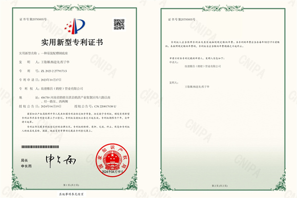 在追求卓越和創新發展的道路上,玫德從未停止腳步。近日,玫德雅昌(鶴壁)管業有限公司再次取得了驕人成績,憑借先進的智能制造能力和創新研發實力,順利通過了2024年度河南省智能車間認定,同時獲得了易裝配槽鋼底座的實用新型專利證書。這不僅是對玫德技術創新和智造實力的認可,更是對品牌價值的再一次肯定。