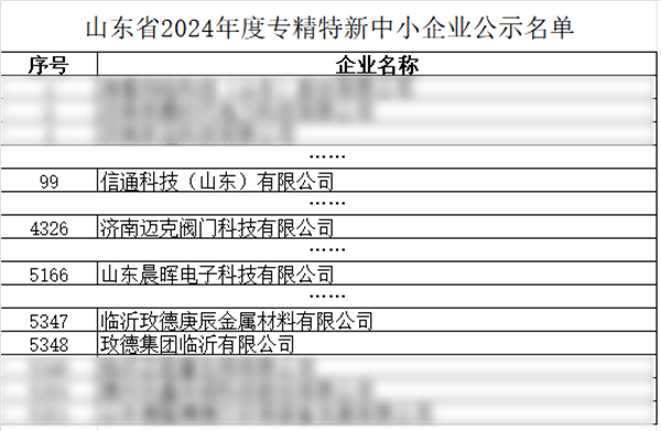 2024年5月28日山東省工業和信息化廳發布《山東省2024年度專精特新中小企業名單公示》通知,玫德集團旗下濟南邁克閥門科技有限公司、山東晨暉電子科技有限公司、臨沂玫德庚辰金屬材料有限公司、玫德集團臨沂有限公司順利通過2024年度山東省“專精特新”中小企業復核,玫德集團旗下信通科技(山東)有限公司首次通過2024年度山東省“專精特新”中小企業認定。