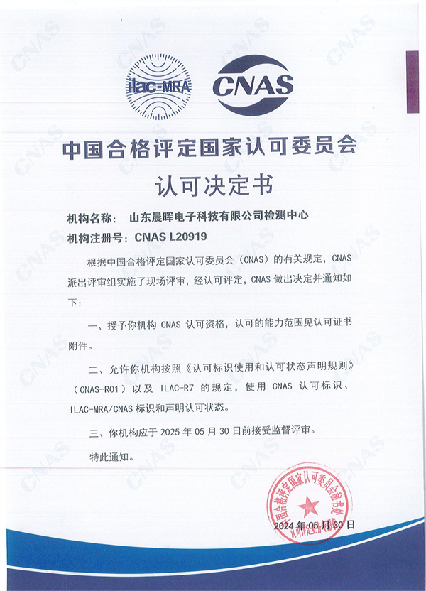 2024年6月5日,玫德集團旗下山東晨暉電子科技有限公司檢測中心順利取得CNAS實驗室認(rèn)可證書,并獲得國際互認(rèn)聯(lián)合認(rèn)可標(biāo)識,正式進入CNAS官方網(wǎng)站公布的獲得認(rèn)可的實驗室名錄。