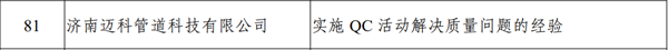 近日,山東省工業(yè)和信息化廳公示了2024年全省質(zhì)量標(biāo)桿典型經(jīng)驗(yàn)名單,經(jīng)企業(yè)申報(bào)、有關(guān)部門推薦、專家論證等程序,濟(jì)南邁科管道科技有限公司《實(shí)施 QC活動(dòng)解決質(zhì)量問(wèn)題的經(jīng)驗(yàn)》成功入選。